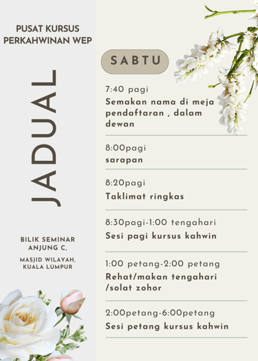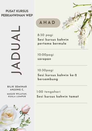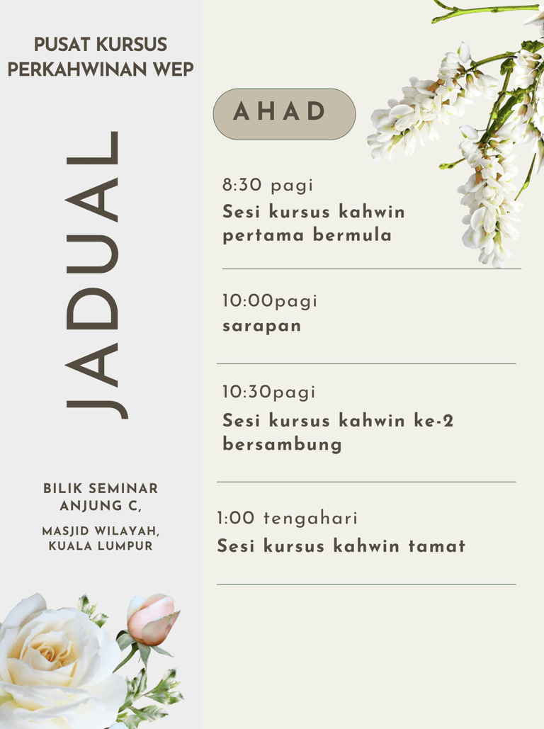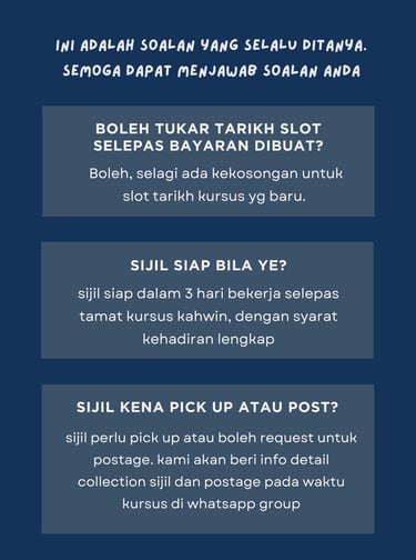 Anda akan dibekalkan dengan Buku Gerbang Perkahwinan sebagai rujukan, buku nota dan pen.